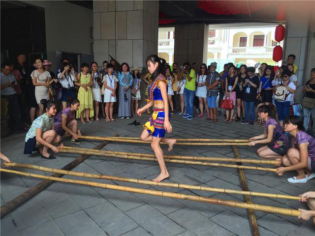 一骑楼老街上,2015重点网络媒体海南行采访团观看当地舞者表演竹竿舞。