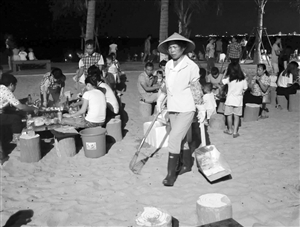 ◀假日海滩保洁阿姨在打扫卫生。 记者 张俊其 摄