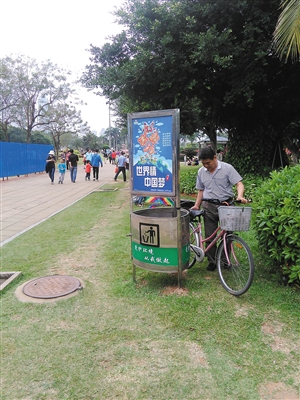 万绿园另一处小径上是一排“大理石装”的新购进垃圾桶,桶壁流线装饰在光洁外壳下格外俏皮,据了解这外壳是高分子合成材料,具有无腐蚀不生锈特点。三角体状的垃圾桶上多了三面围起的宣传牌,牌上是图文并茂“世界情,中国梦”宣传画。