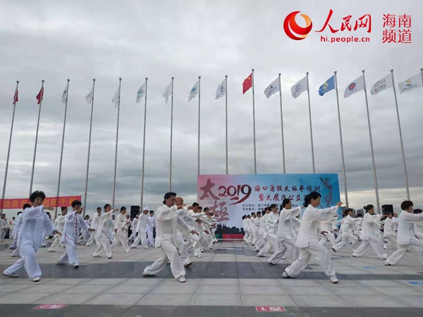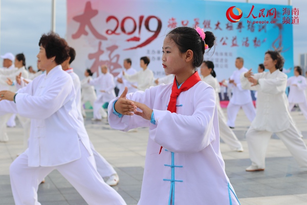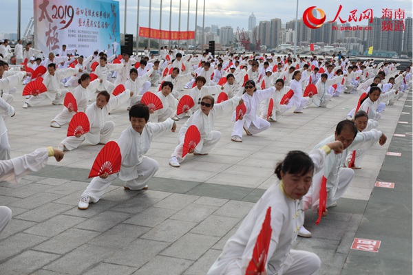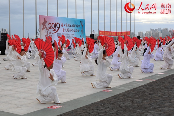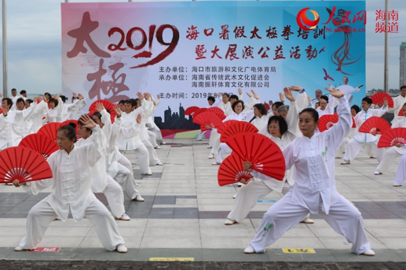 8月3日,由海口市旅游和文化广电体育局主办的2019海口市暑假太极拳培训暨大展演公益活动在海口举行。经过为期一个月紧锣密鼓地排练,600余名太极拳拳手首登国家帆船基地公共码头进行公益展演,旨在弘扬五千年优秀中华民族太极文化,推动海口全民健身运动发展。
