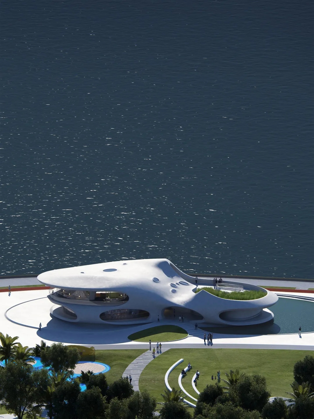 马岩松带领的MAD建筑事务所发布海口"云洞图书馆"设计。一体成型的白色建筑像是多维的时空隧道,连接了城市与海岸、现实与想象。