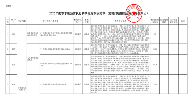 涉及我司的项目是:海口湾畅通工程(一期)(含龙华区段、美兰区示范段两个项目)专项审计调查海审投资报〔2020〕45号中提出的“造价控制存在的问题”,包括“施工过程中变更随意,未按规定报批,存在施工损失浪费现象。”以上问题主要包括设计方案不合理、挖除重建等4个方面造成的损失浪费(①现场工程量确认表涉及工程费用约 110.91 万元;②大叶油草重新挖除变更为种植马尼拉草施工浪费金额约 6.94 万元;③雨水花园及部分廊架基础重新拆除施工浪费金额约 103.97 万元;④栏杆保护性拆除目的未达到,多计进度款 73.55 万元等。)以上第①②③项已于2021年6月完成设计变更手续,第④项整改情况在109问题中描述,均已经完成整改,相关佐证材料已经报送市审计局。旅文公司将在后续的项目建设中,要求设计单位充分论证,采取合理方案,避免造成浪费。