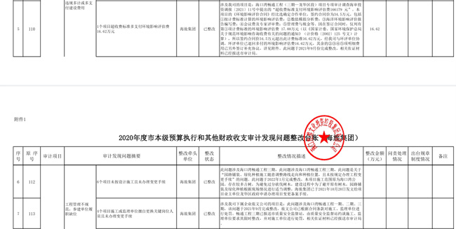 涉及我司的项目是:海口湾畅通工程(三期—龙华区段)项目专项审计调查海审投资调报〔2021〕11号中提出的“超收费标准支付环境影响评估费166179 元”。本项目的《环境影响评价合同》经比选确定合作单位,签约合同价为34.5万元,包括①按计费标准计算的环境影响评估费;②数值模拟分析费;③海洋环境影响评价报告编写费;④会议费及专家评审费;⑤管理费与税金等。因在签订合同时,仅列有第①项计费标准的环境影响评估费 17.88万元(以《国家计委、国家环境保护总局关于规范环境影响咨询收费有关的问题的通知》(计价格〔2002〕125 号文)计算),所以签约合同价34.5万元超出此计费标准16.62万元,经我司与环评单位协调,环评单位已退回多付的环境影响评估费16.62万元,其余的②③④⑤项明细费用已另外签订补充协议,详见附件。此问题于2021年9月份完成整改,相关佐证材料已经报送市审计局。旅文公司将在后续的工作中,完善《环境影响评价合同》计费信息,有理有据的支付费用。
